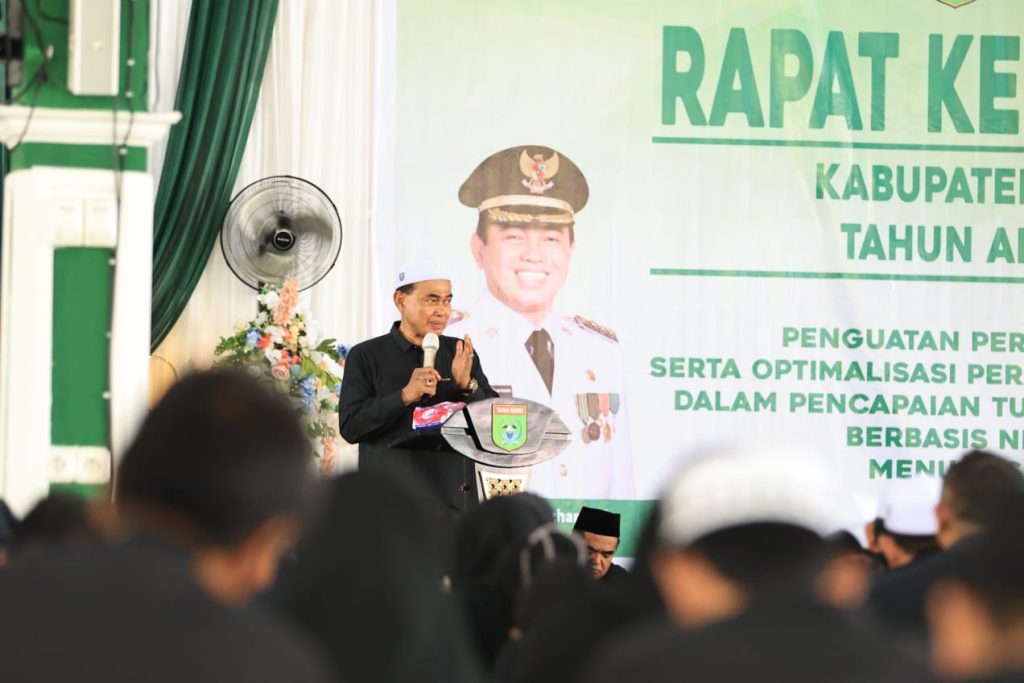 Agenda rapat kerja meliputi pemaparan hasil evaluasi kinerja pembangunan daerah, pemaparan evaluasi reformasi birokrasi, dan program Satu Desa Satu Masjid.