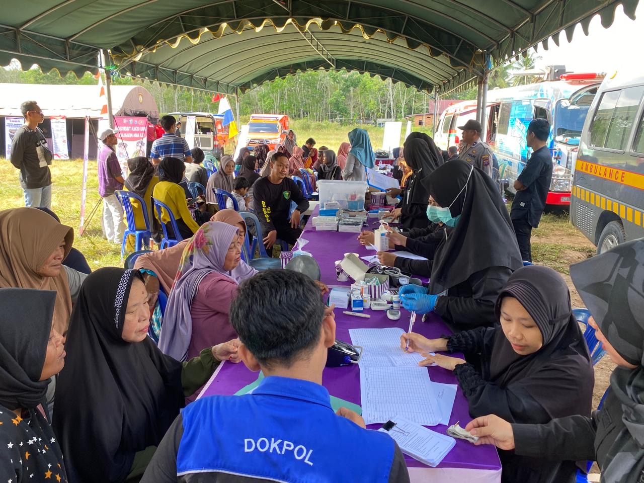 Masyarakat berdatangan ke lapangan samping SDN Batulicin Irigasi, yang sudah dipenuhi tenda pelayanan hingga Mobil Samsat Keliling.