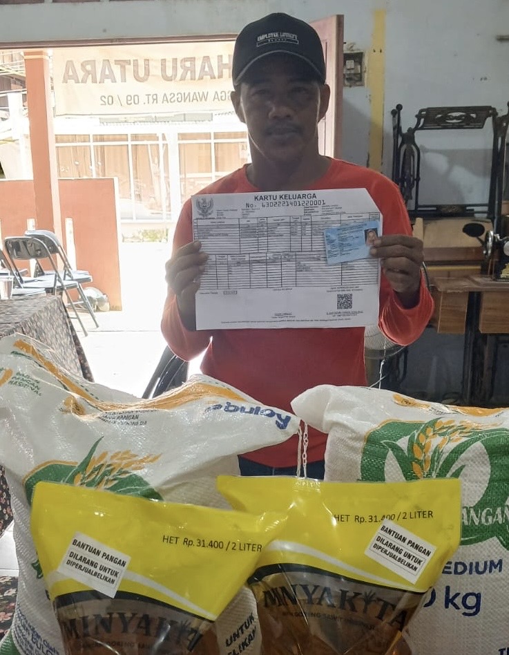 Untuk pengambilan bantuan, warga diwajibkan membawa KTP dan KK asli, serta tidak diperkenankan untuk diwakilkan. Setiap KK menerima 10 kilogram beras dan 2 liter minyak goreng.