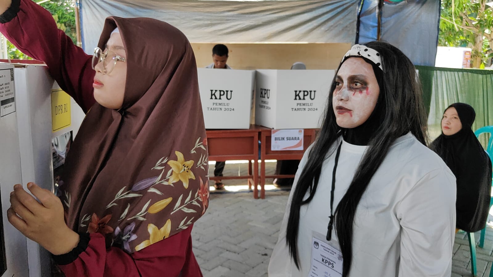 Di TPS yang memiliki DPT sebanyak 230, panitia mengenakan kostum Pocong, denun, joker, kuntilanak dan beberapa kostum hantu seram lainnya.